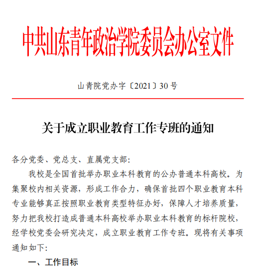 近日,学校党委会研究决定,成立职业教育工作专班,教务处处长孟凡兵担任组长,yl6809永利检测中心副院长魏巍担任副组长,专班成员来自教务处、教学质量监控与评估中心、人事处、发展规划与建设处、yl6809永利检测中心。