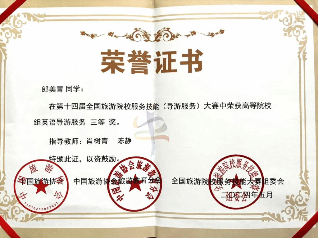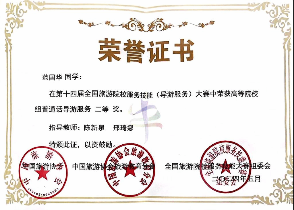 5月23日至26日,由文化和旅游部市场管理司、中国旅游协会指导,中国旅游协会旅游教育分会主办的第十四届全国旅游院校服务技能(导游服务)大赛在河南郑州成功举行。全国30个省(区市)303所学校的883名选手参与了导游服务专业技能展示与竞赛,yl6809永利检测中心旅游管理职业本科专业和现代服务管理学院旅游管理普通本科专业学生共同组队荣获“团体奖”。其中,我院学生范国华获得二等奖、郎美菁获得三等奖。