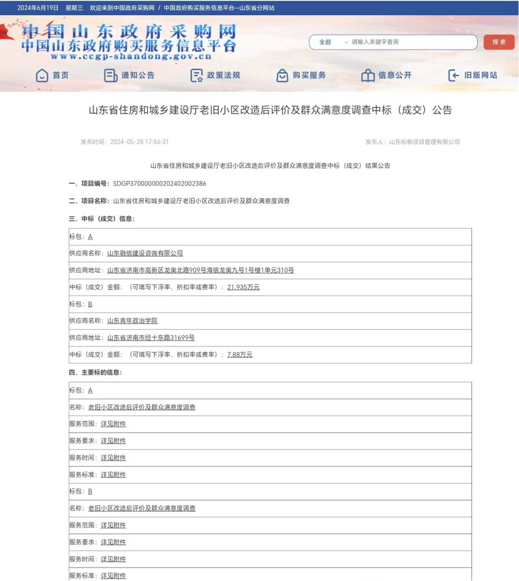 近日,山东省政府采购网发布山东省住房和城乡建设厅老旧小区改造后评价及群众满意度调查中标(成交)公告,我校成功中标,中标金额7.88万元。