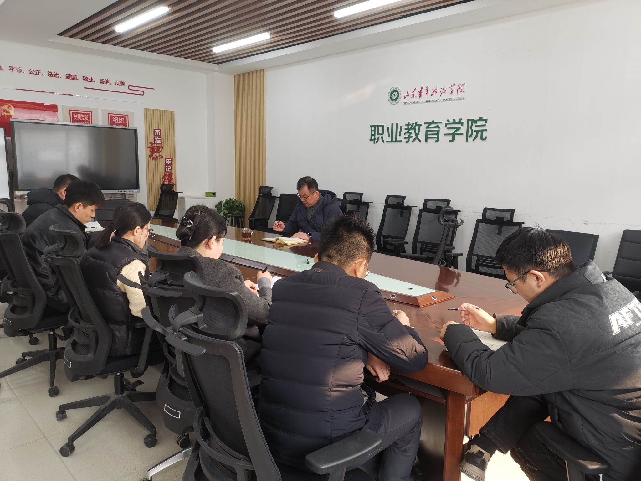 牟晋京总结了学院2024年的学生工作情况,对大家的付出表示肯定,剖析了工作中存在的短板与不足,重点针对2025年新学期各项任务进行了部署和规划。一是加强学风建设,营造积极向上的学习氛围。二是全力推进毕业生就业工作,结合职业教育专业提升就业质量。三是鼓励在校生社会兼职和创新创业,培养实践能力。四是丰富第二课堂活动,促进学生素质全面发展。五是加强宿舍卫生管理,营造宜居宜学的生活环境。六是强化学生安全管理、关注重点群体,筑牢校园安全防线。