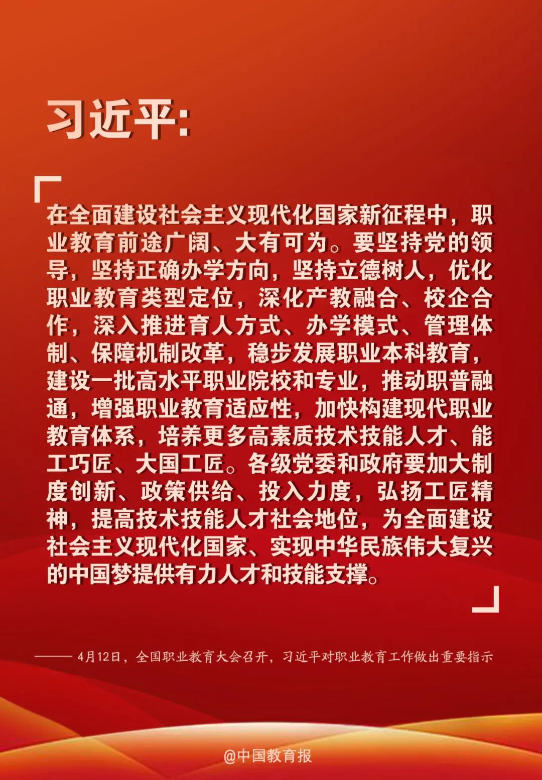 中共中央总书记、国家主席、中央军委主席习近平近日对职业教育工作作出重要指示强调,在全面建设社会主义现代化国家新征程中,职业教育前途广阔、大有可为。要坚持党的领导,坚持正确办学方向,坚持立德树人,优化职业教育类型定位,深化产教融合、校企合作,深入推进育人方式、办学模式、管理体制、保障机制改革,稳步发展职业本科教育,建设一批高水平职业院校和专业,推动职普融通,增强职业教育适应性,加快构建现代职业教育体系,培养更多高素质技术技能人才、能工巧匠、大国工匠。各级党委和政府要加大制度创新、政策供给、投入力度,弘扬工匠精神,提高技术技能人才社会地位,为全面建设社会主义现代化国家、实现中华民族伟大复兴的中国梦提供有力人才和技能支撑。