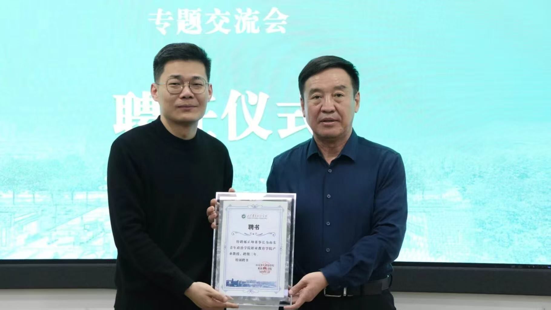 张杰向郇正坤颁发“产业教授”聘书,期待借助其行业影响力与资源优势,进一步深化校企合作内涵,搭建广阔的人才培养平台,助力培养更贴近市场需求的复合型人才。