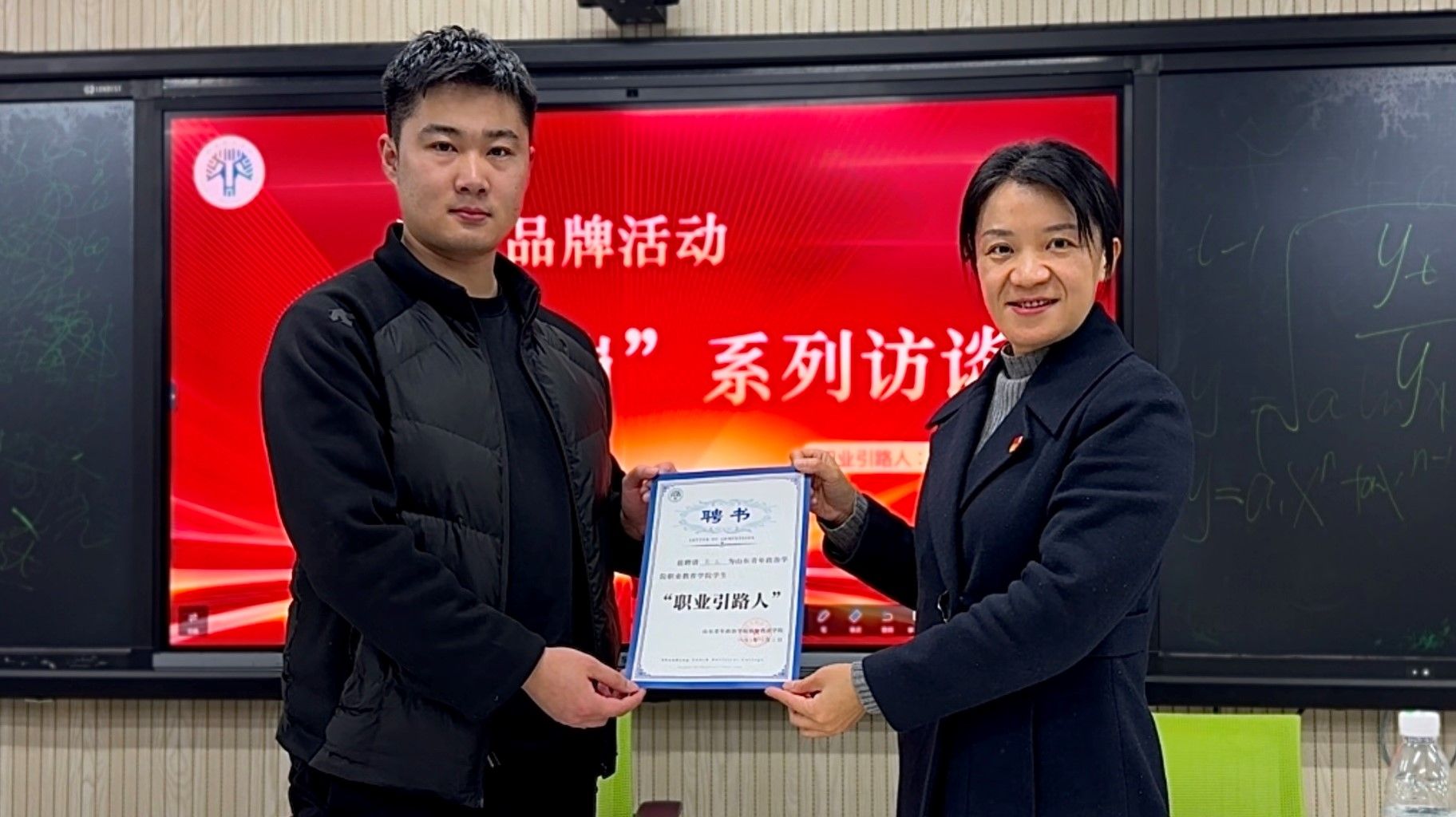 张双娜为肖龙颁发聘书,聘请肖龙为“职业引路人”,期望在肖龙的带领下,增强同学们对金融证券行业的了解。